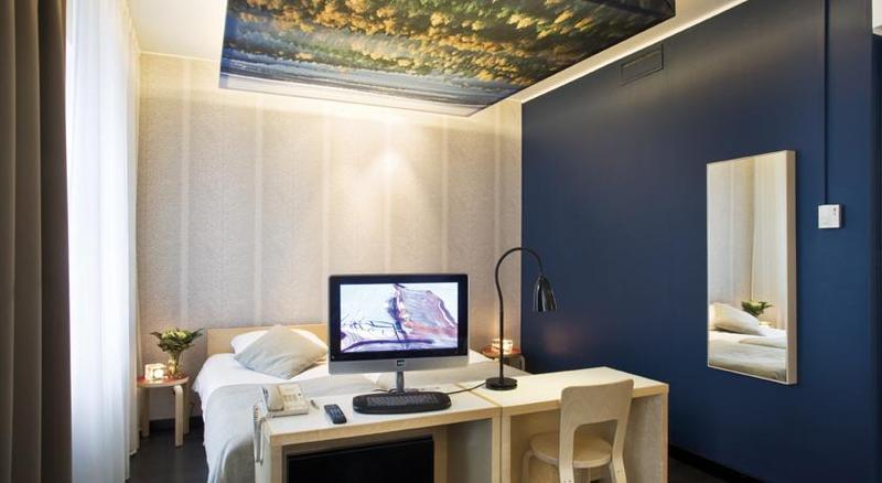 The hotel is located in Helsinki city centre, close to Kamppi metro and bus station. It is a 10-minute walk to the seafront and the airport is 19 km away. This theme hotel, which was renovated in 2006, is designed in Finnish style, and comes furnished with Artek and other top-designer products. It is the local alternative to chain hotels. It offers a strong sense of being in Finland, with its elegant combination of Nordic Design, Finnish culture and hospitality. It is air-conditioned and comes with a lobby with 24-hour reception, hotel safe and currency exchange facilities. Cafe, bar, dining and conference facilities are provided. WiFi, car park and room and laundry services are available. The rooms come fully - equipped and with adjustable air-conditioning. There is a sauna available to guests.