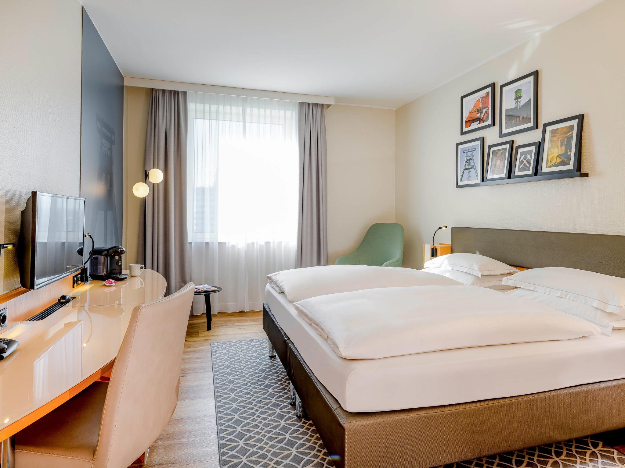 The Mercure Hotel Bochum City is just a short walk from Bochum's main train station. The hotel's two modern high-rise towers are an architectural highlight of the city, the upper floors offering spectacular views over the Ruhr region metropolis. And the c harm delivers on what it promises: The Mercure Hotel Bochum City is the only 4-star hotel in downtown Bochum. All 162 Comfort Rooms are air conditioned and have WIFI. You can park your car in the hotel's secure indoor car park.