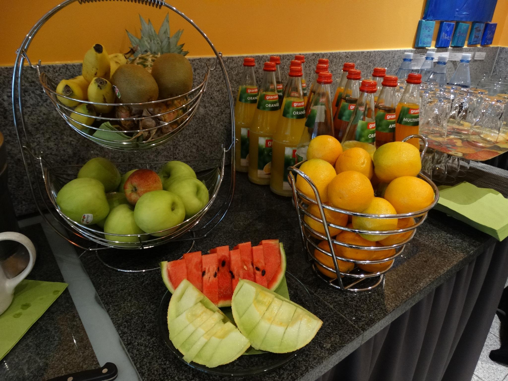 In the morning we greet our guests with coffee and a big variety of teas - served hot and unlimited! Our breakfast buffet is rich and next to the "usual" ingredients you can find fish (salmon), freshly pressed orange juice, Smoothies and fresh fruit, for example.