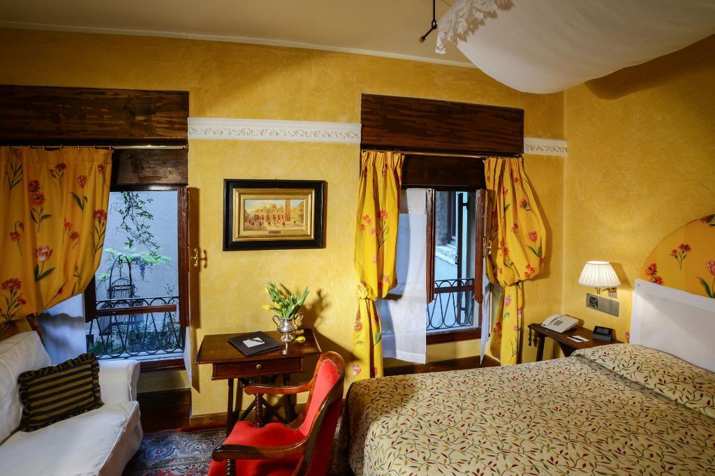 The hotel is elaborately decorated with dark wooden ceiling beams, medieval-style frescoes, and sumptuous fabrics for an eclectic yet charming look. Rooms are furnished with antique furniture and oriental rugs, each one completely original and unique. The hotel boasts a cosy winter garden known as Orangerie, where guests can sip a cup of coffee or enjoy a light snack, as well as a romantic candlelit terrace surrounded by lush vegetation. This is the ideal place for a lavish and pampered holiday in Verona.