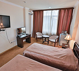 The Abu Dagi Hotel is set near the bus station and airport. Accommodation is available in 42 rooms, including 10 Suites, 25 Standard rooms, 3 Twin Standard rooms, and 4 VIP rooms. Each room includes - TV, telephone, fridge, air conditioning, toiletries, and Wi-Fi Internet access. Guests can make use of kettle, tea set, tableware, cosmetic kit, and hair-dryer.