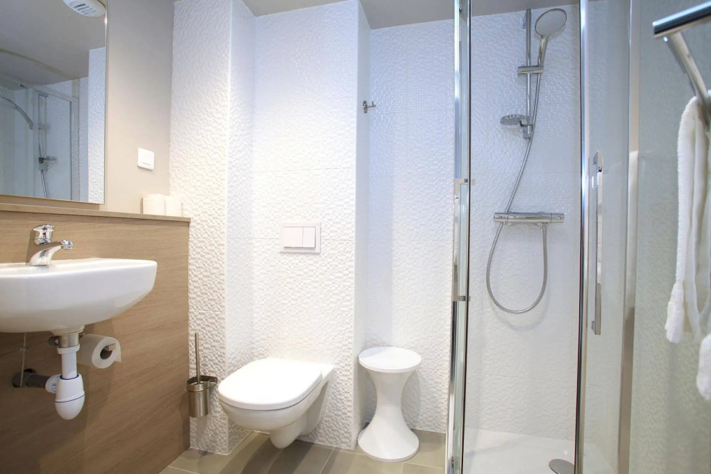In the room, for you, there is a shower and a TV. The room equipment depends on its category.