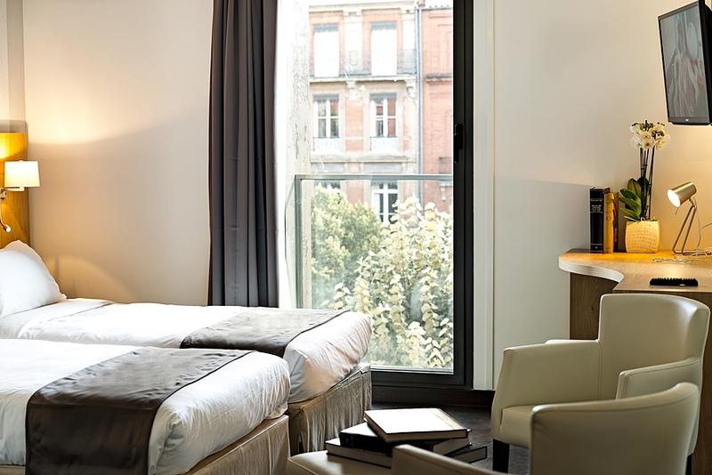 This modern city hotel enjoys a great location in the centre of Toulouse, just across the street from the Esquirol metro station. The Augustins Museum is only a stone's throw away, and guests will be able to easily reach attractions such as the 11th-century Saint Sernin Basilica and Saint Raymond Museum in less than a 15-minute walk.