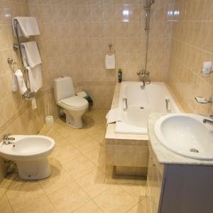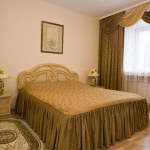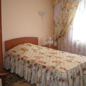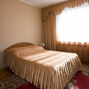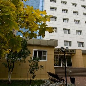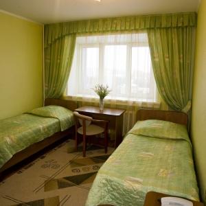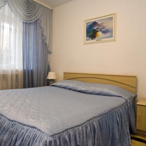 The nine-storied hotel building provides accommodation for 106 people in 73 rooms of various categories. Each room has a bed with bedside table, built-in wardrobe, mirror, desk with soft chair, armchair, LED TV, electric kettle, tableware, full bathroom with tub, toiletries, and cosmetic kit. Junior Suites offer living rooms with upholstered furniture, and Suite includes a living room with a fully equipped kitchen.