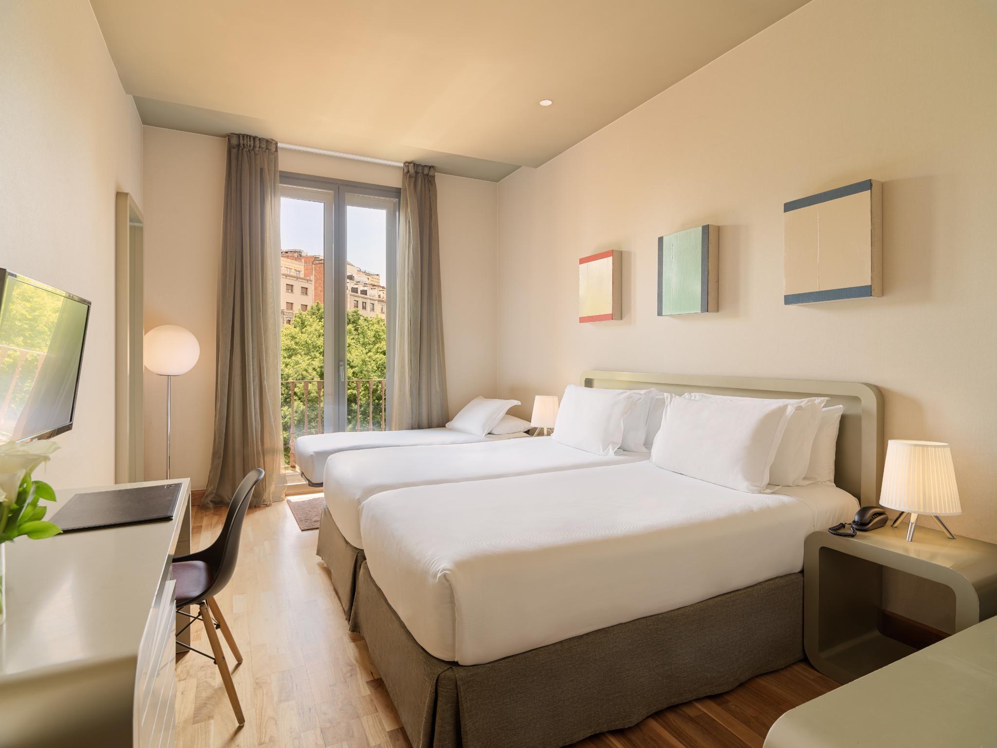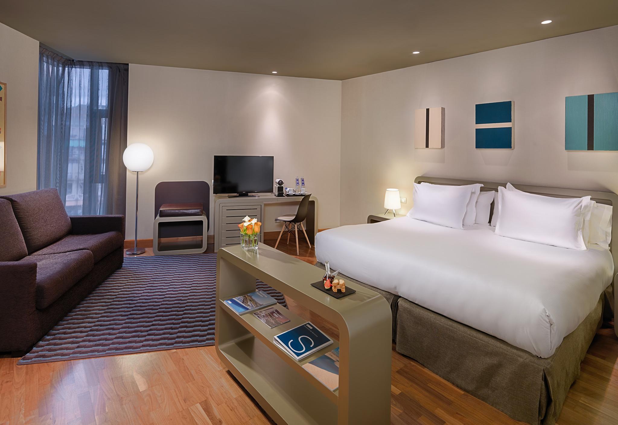 This elegant hotel, situated in the heart of the Eixample, enjoys a very good location on the renowned Avenue of Gran Via de las Corts. The hotel is within walking distance from Plaza Cataluna, Las Ramblas and other site os cultural and historic interest. The historic centre is reachable, if preferred, with convenient transport links located just outside the hotel. Sants Station is approximately 1.5 km from the hotel and the airport is approximately 8km from the hotel. This is an ideal hotel from where to start discovering this wonderful city.