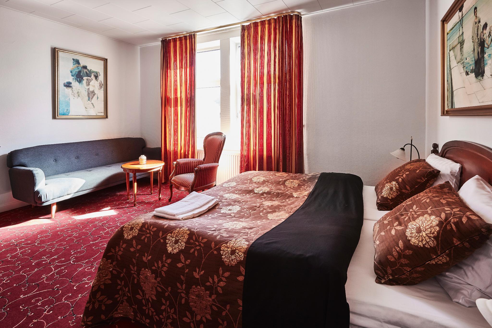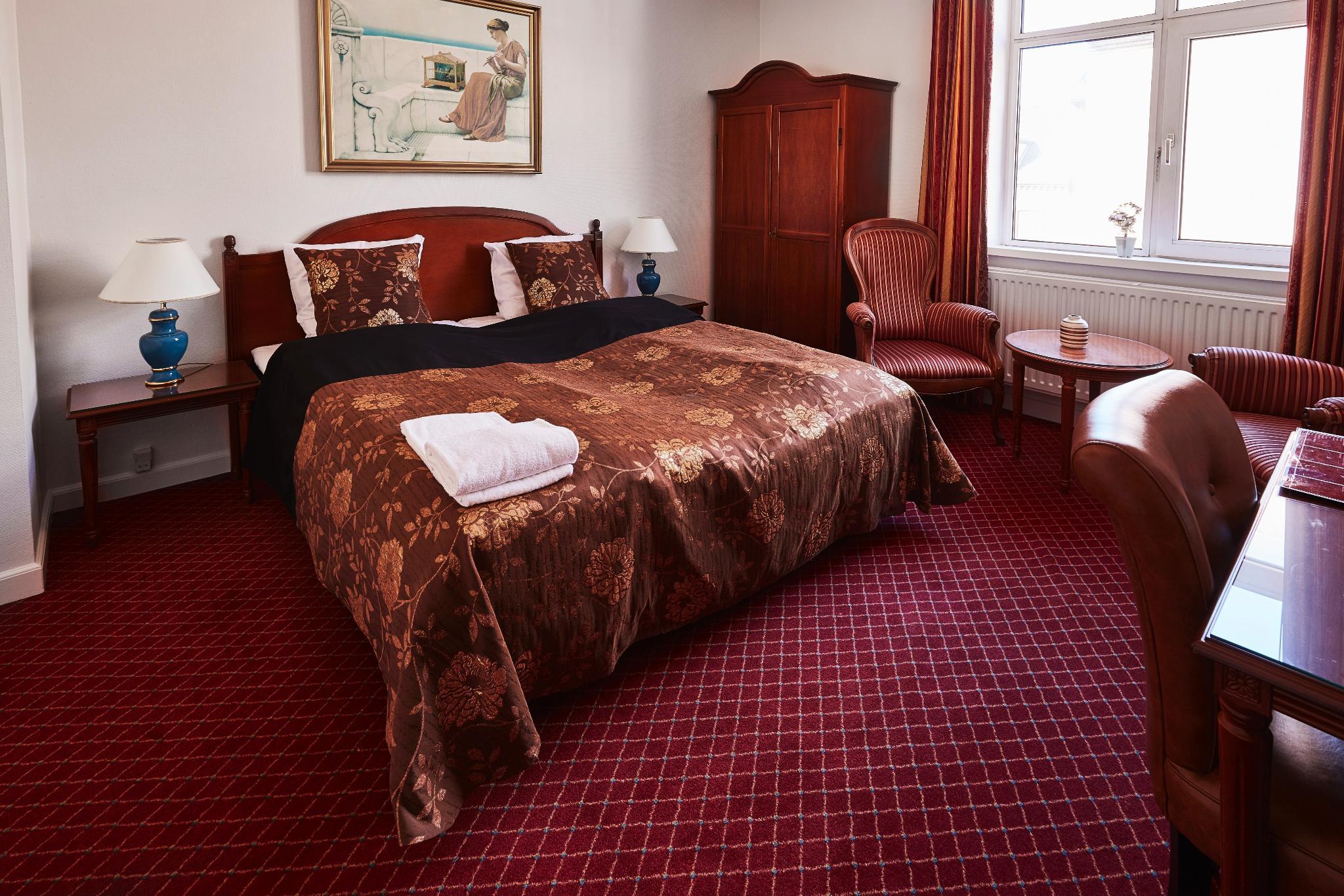 This charming and traditional hotel is situated in central Odense, where it is surrounded by quaint and charming streets dotted with shops, restaurants and pedestrianized areas. On-site facilities include a 24-hour reception and check-out service, a bar and a restaurant. The guest rooms feature antique-style wooden furniture and are equipped with free wireless Internet access, as well as a TV, a minibar and individually regulated heating. The en suite bathrooms feature a shower and a hairdryer. During the summer months children can play in the specially designated areas, helping to make the hotel a family-oriented establishment. Each day a large buffet breakfast is served in the hotel restaurant. It includes a variety of specialities from Funen, as well as a good selection of organic produce. A dinner buffet is also available in the evenings.