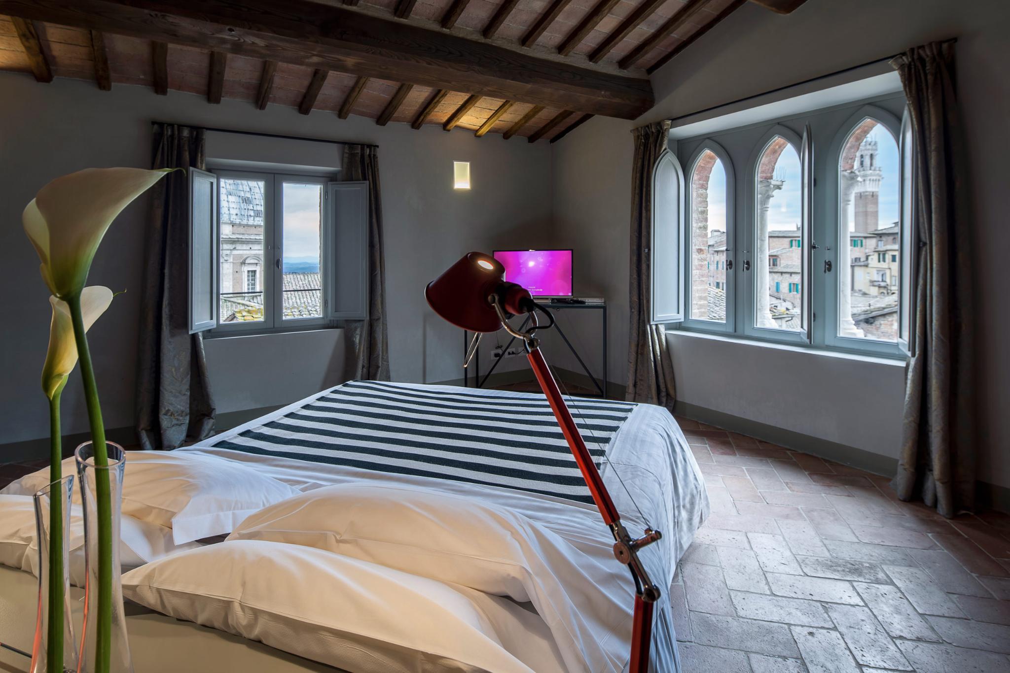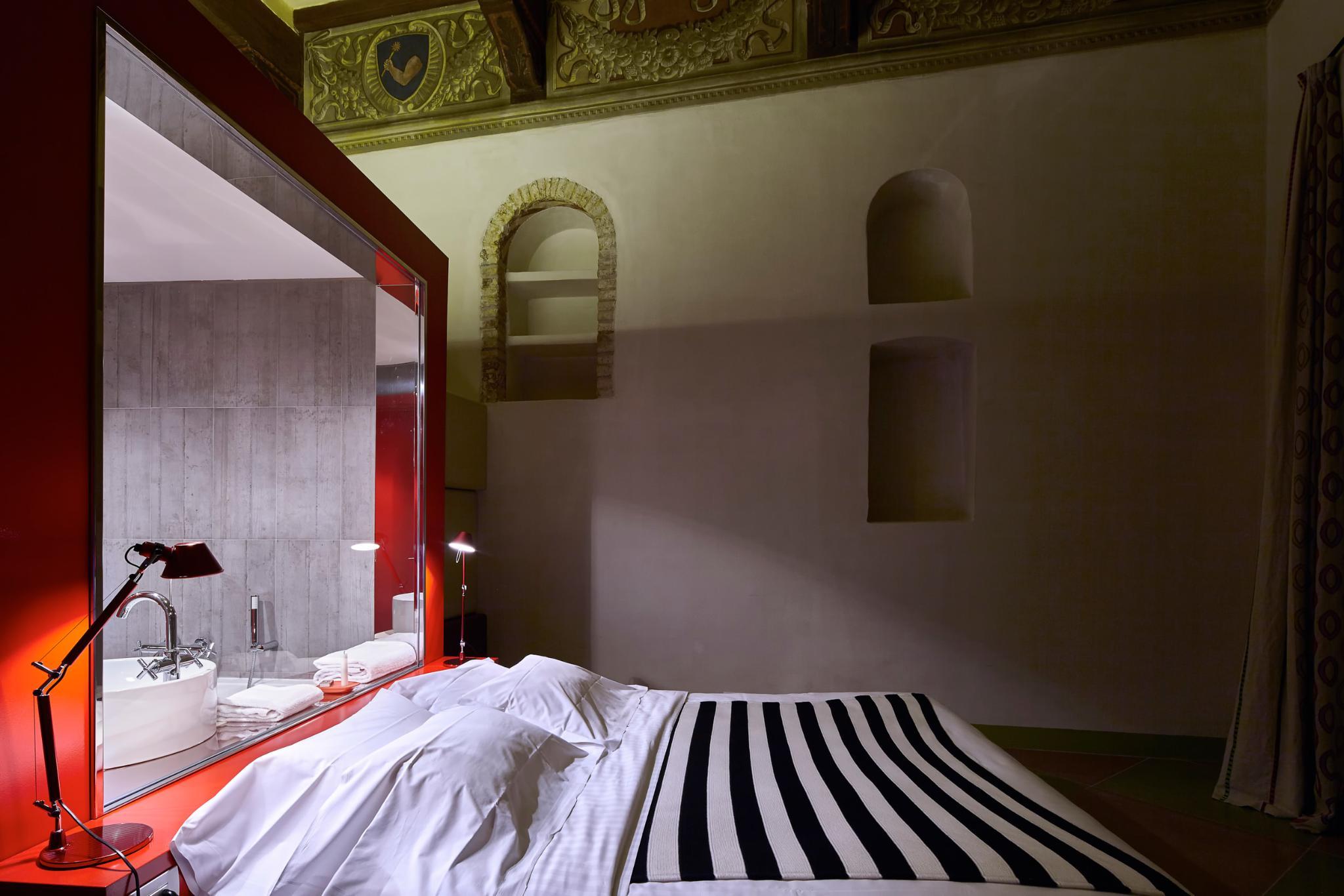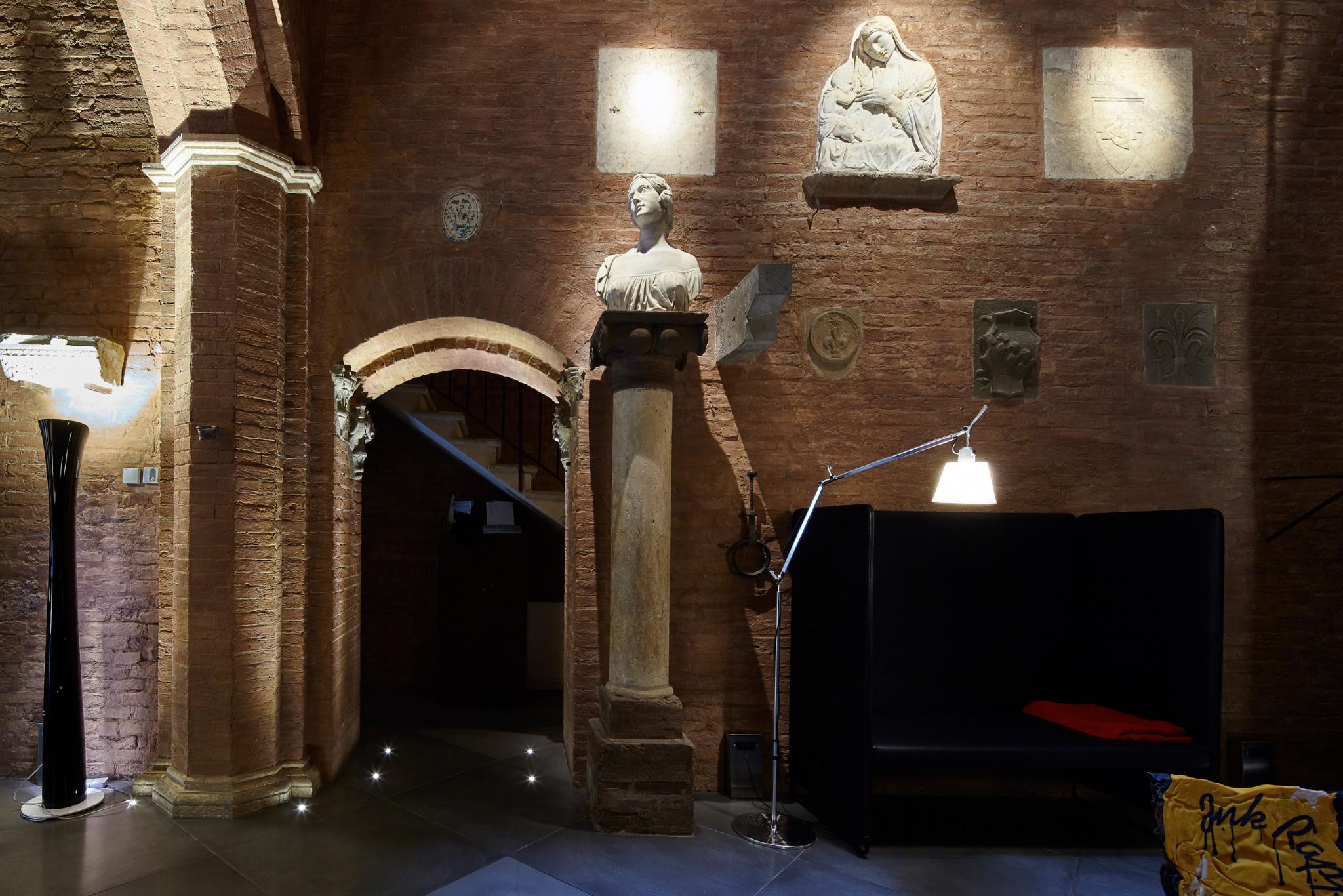The Palazzetto Rosso is located in a stunning thirteen century building completely renovated with design furnishings. It was most likely a locanda, meaning that it already hosted travelers during the Middle Age, as Tuscany was an intense trade and business center in Europe. The Palazzetto Rosso's brick facade's lay out follows multiple shapes such as large ribs and geometrical patterns, skillfully organized upon old planning regulations dated from the Middle Age, and distinctive to Siena. This outstanding historical facade is completed by ensigns and flares made of wrought iron and dated from the Middle Age as well.