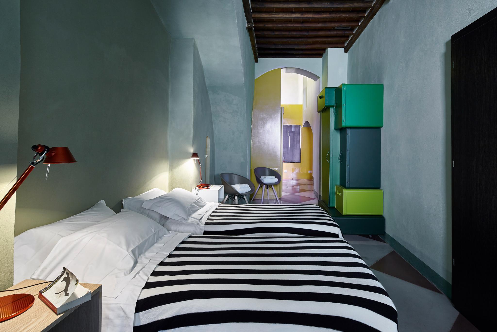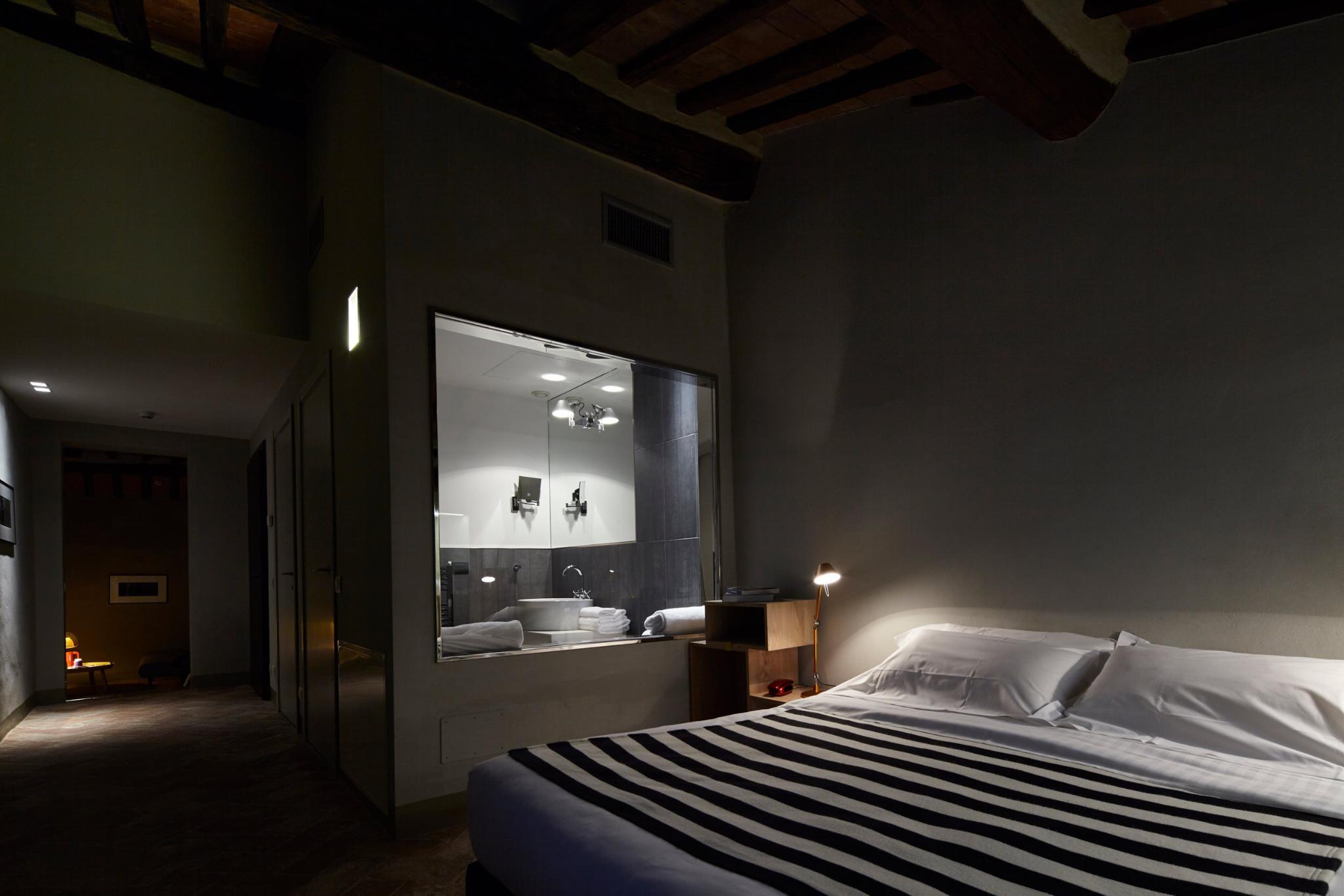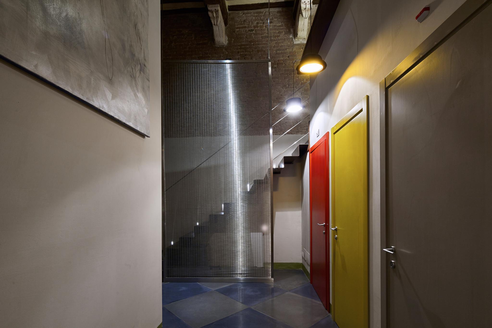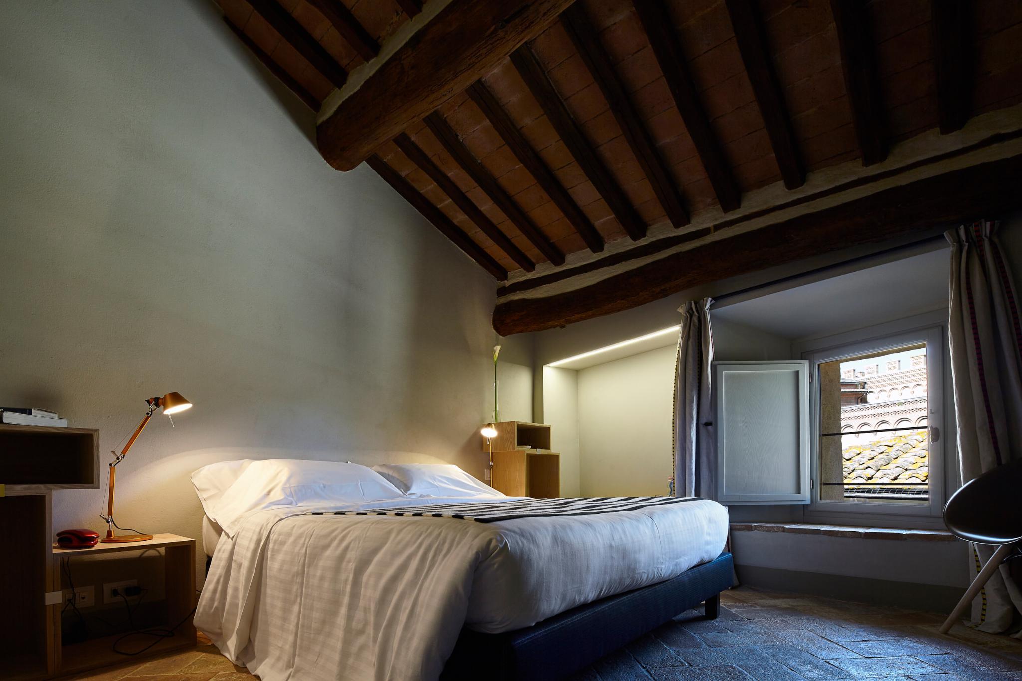 The Palazzetto Rosso is located in a stunning thirteen century building completely renovated with design furnishings. It was most likely a locanda, meaning that it already hosted travelers during the Middle Age, as Tuscany was an intense trade and business center in Europe. The Palazzetto Rosso's brick facade's lay out follows multiple shapes such as large ribs and geometrical patterns, skillfully organized upon old planning regulations dated from the Middle Age, and distinctive to Siena. This outstanding historical facade is completed by ensigns and flares made of wrought iron and dated from the Middle Age as well.