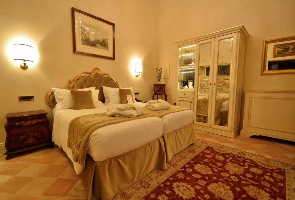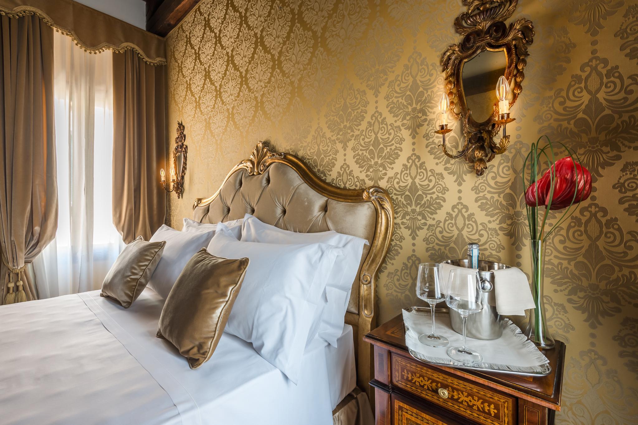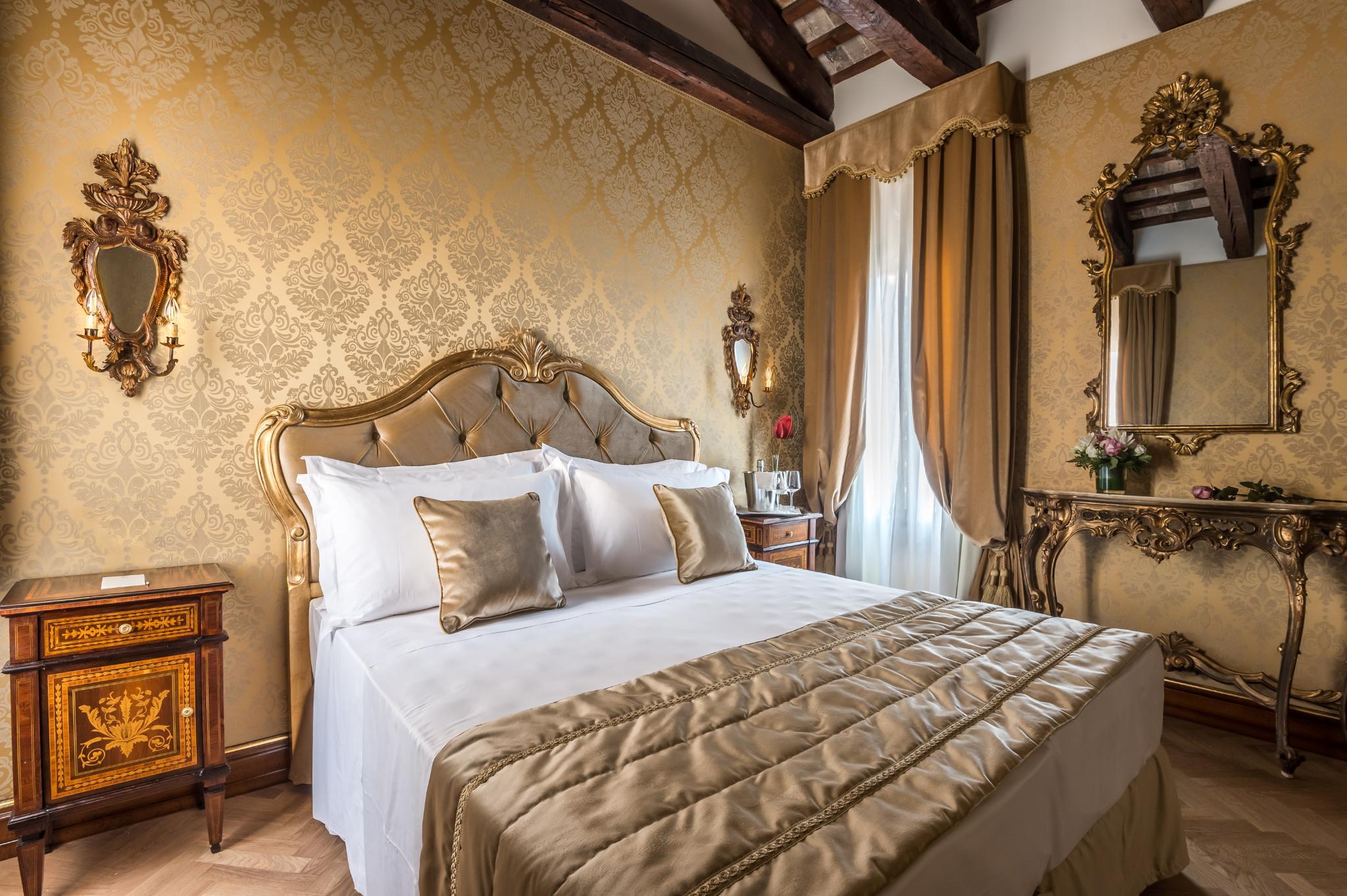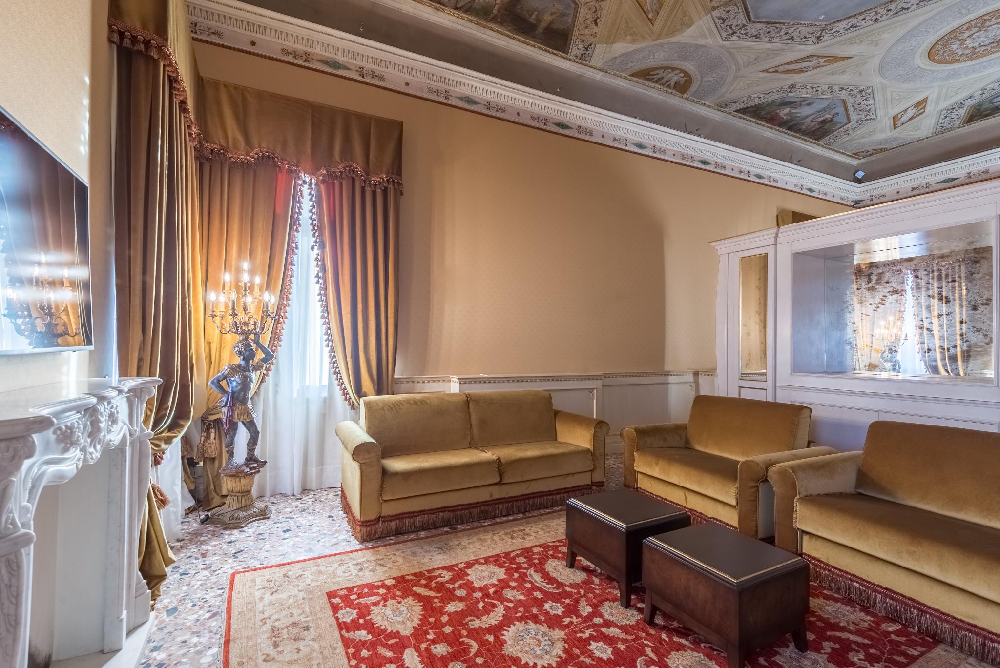 This is a superb example of Gothic Venetian art from the 15th Century, it is nowadays a 4 Stars Hotel located just in front of the little Canal of San Trovaso and in the middle of one of the most characteristic "Sestieri" ( Districts) of Venice. The new and restructured Palace is characterized by an important facade and frescoes from the early 1800s. In all its rooms and spaces it preserves the splendor of its noble and centenary past, where the Venetian style is exalted by its Murano Chandeliers, the original floors "Alla Veneziana" and by the precious furnishing of its "Saloni" (Salons) and Rooms.