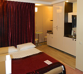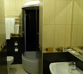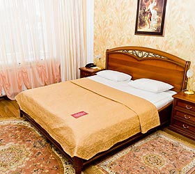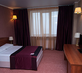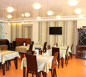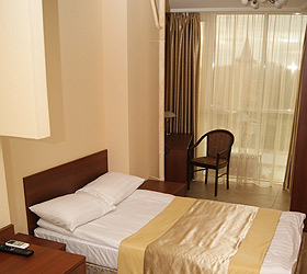 All rooms feature unique interior design, differing in drapery color palette and bathroom finish. In total, there are 30 rooms of three categories - Junior Suites, Suites and themed VIP Suites - Prague, Venice and Romance. The Junior Suite room includes - ante-room with wardrobe, luggage case, shoe-shine kit, mirror and umbrella; bedroom with comfortable bed, bedside tables, desk, chair, telephone, fridge, mini bar, plasma panel, wall split air conditioner, Wi-Fi Internet access; bathroom with modern fitment, shower cubicle, hair-dryer, bathrobe, slippers, snowy towels and toiletry accessories.