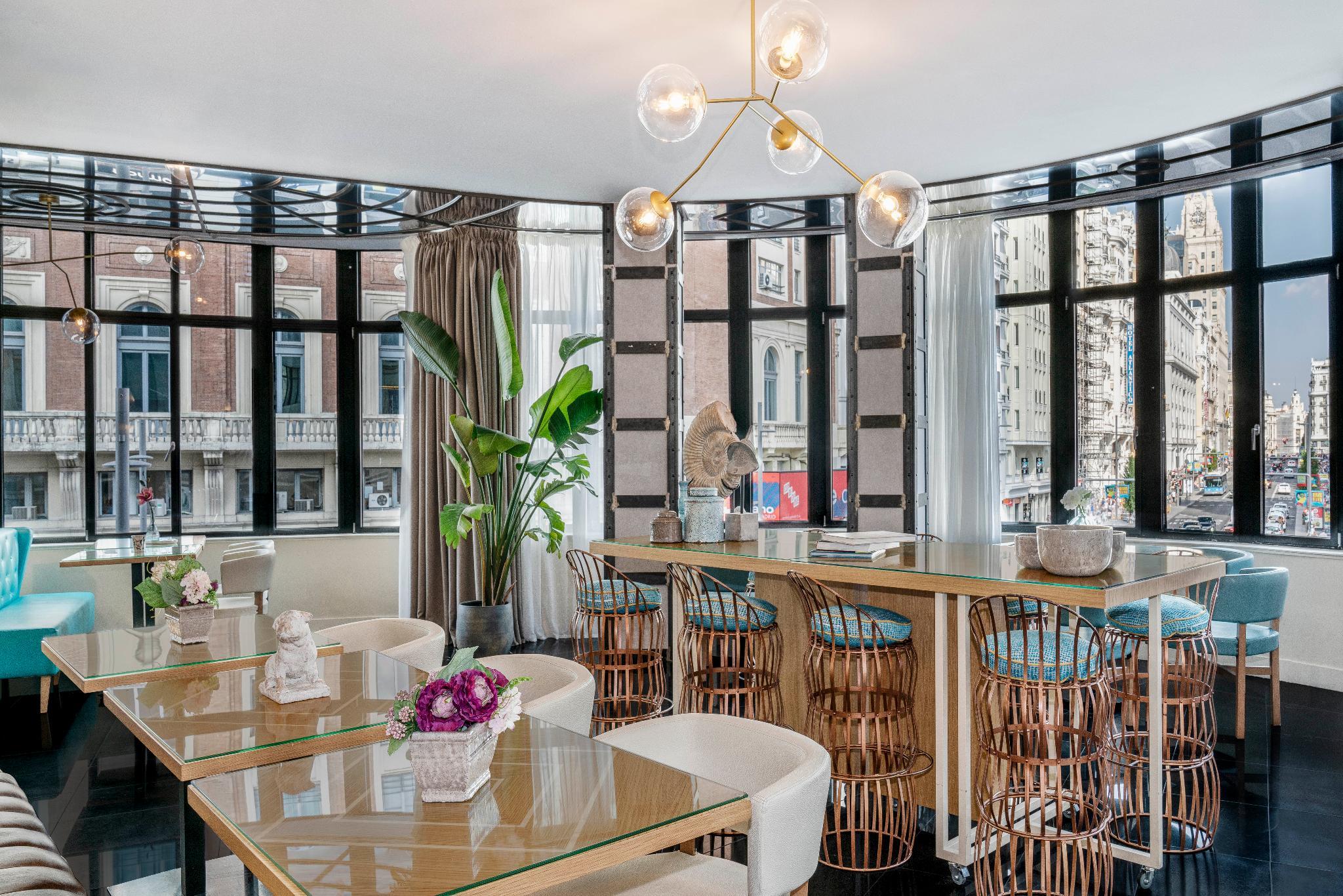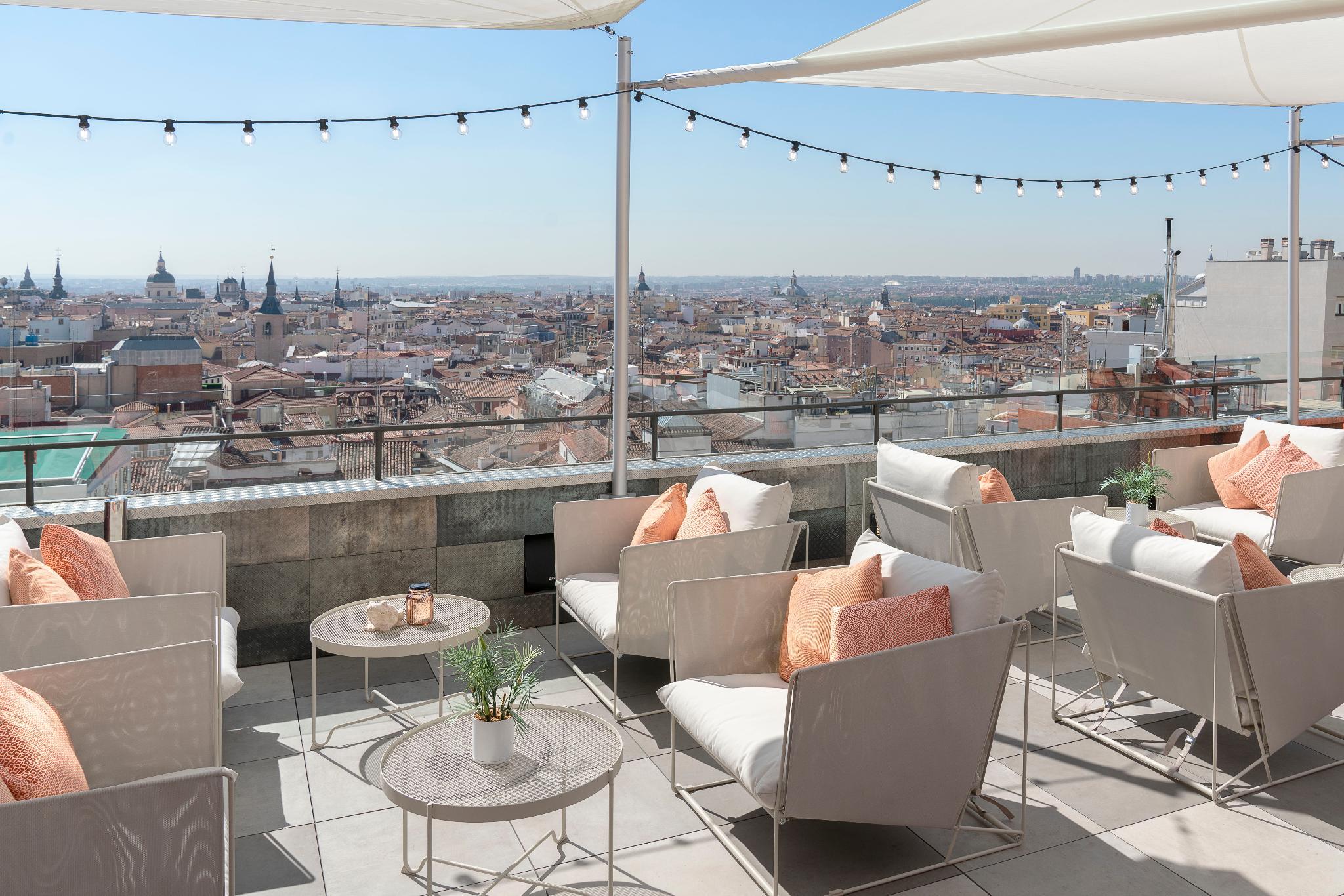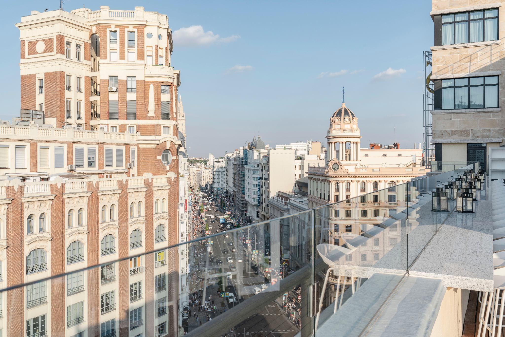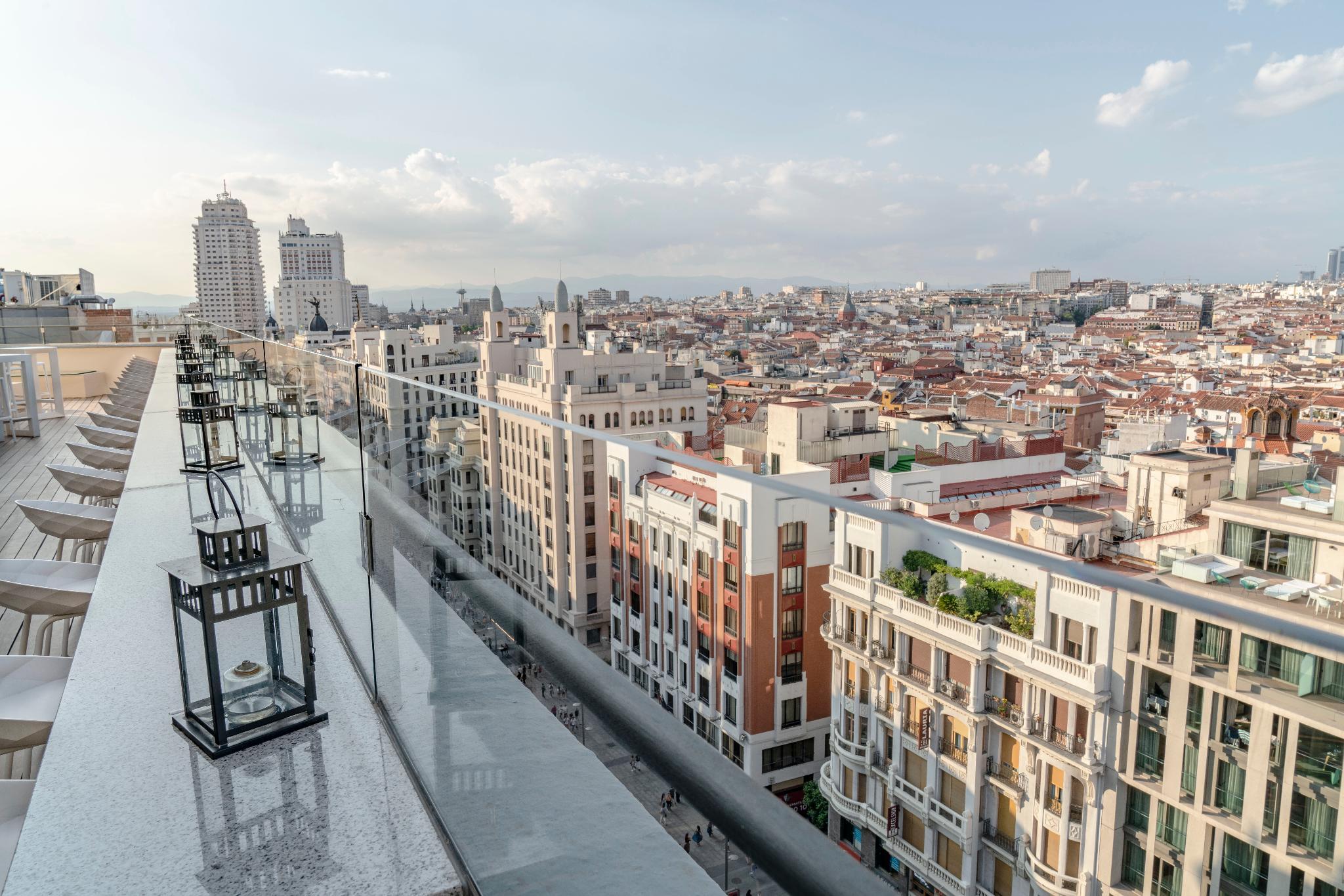 This trendy establishment is overlooking the lively Gran Via is 15.9 kilometres from Madrid airport. The hotel is only a 1 minute walk from the Callao Metro Station, 1.3 km from the Royal Palace of Madrid, where travellers can explore the official residence of the Spanish Royal Family in the city of Madrid, although the Palace is now only used for state ceremonies and 8 km from the Plaza Mayor, packed with cafes and bars for holiday makers to relax and enjoy the beautiful surroundings. At the hotels ground floor is the Movie Theatre Cine Capitol where guests can catch live entertainment including opera and ballet at the Teatro Real, a 6-minute walk away. Thanks to its excellent location in the city centre, with very easy access to the main attractions that the area has to offer, guests will find themselves in the ideal location from which to explore the delights of the area. Facilities in the hotel include a buffet breakfast, a rooftop terrace where guests can relax with a drink enjoying the city views, also featured is a meeting room for business travellers. The modern spacious rooms feature stylish decor, bright accents and slick furniture, a luxurious bathroom with a hair dryer, and the rooms are soundproof to help ensure a restful night. All the rooms are thoughtfully designed and beautifully finished to ensure guests enjoy perfect comfort and convenience during their stay.