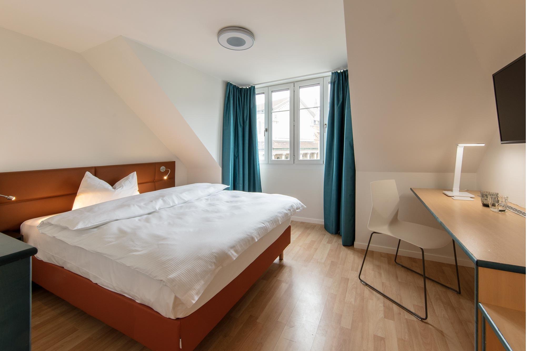 Views of the historic courtyard and part of the old city wall or in rooms and junior suites on the penthouse floors with a fantastic view of the city and on Zurich's Uetliberg.