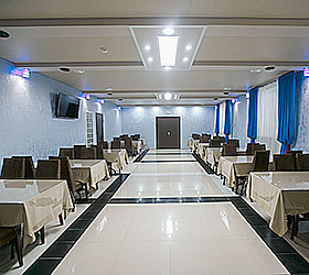 A cafe for 42 people is located on the fourth floor of the Baden-Baden guest house. Visitors are offered dishes of European cuisine. The cafe works from 7 to 22. Every morning guests are welcome to breakfast.